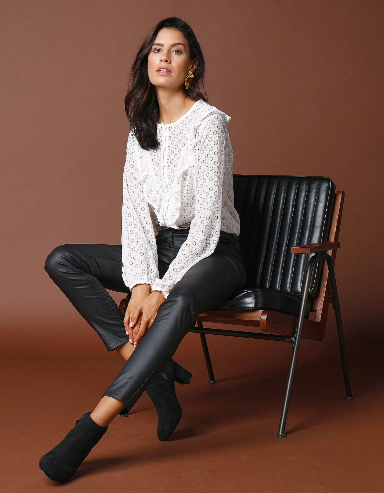 – Plastron en V sous le col bordé d’un petit volant sur le contour