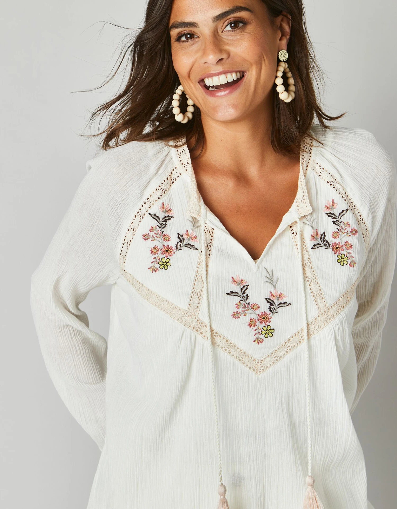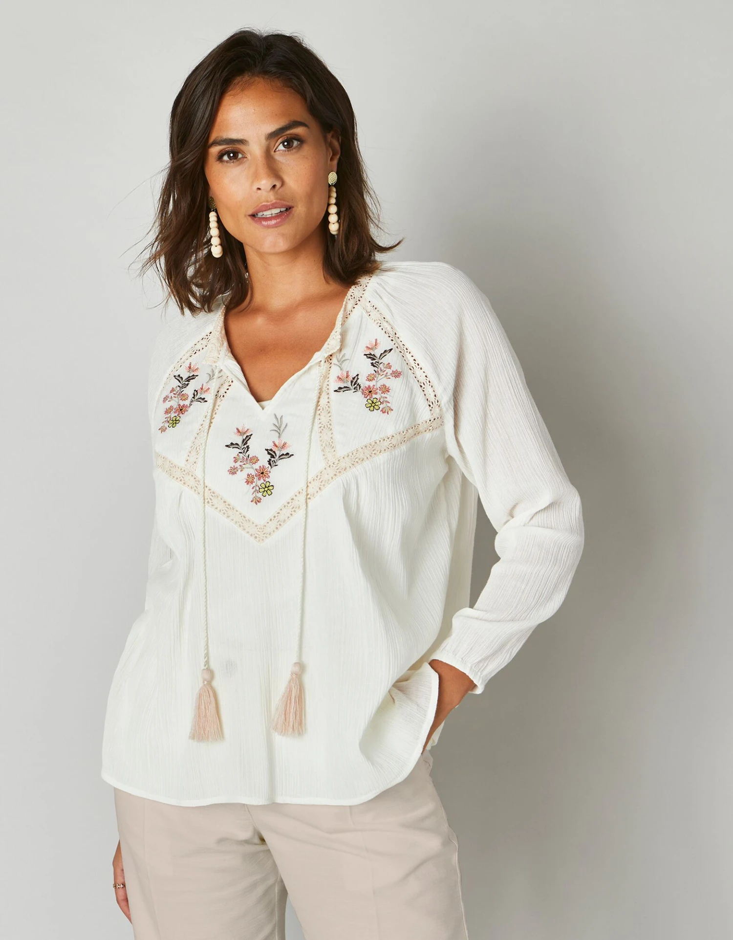 – Col rond fendu souligné de macramé, avec liens finis par un pompon