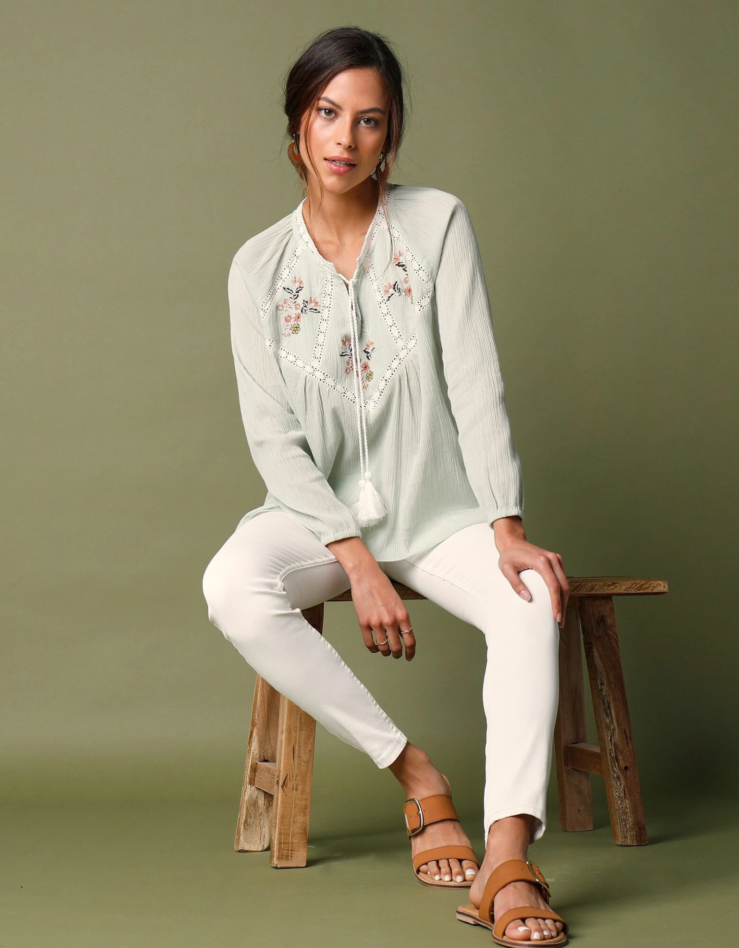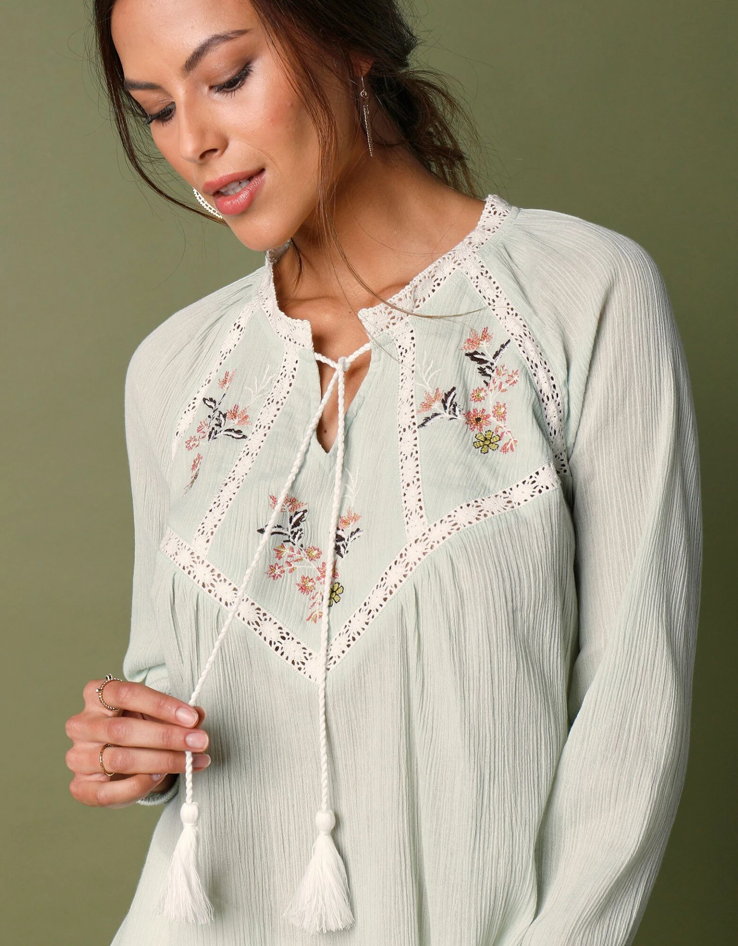 – Col rond fendu souligné de macramé, avec liens finis par un pompon
