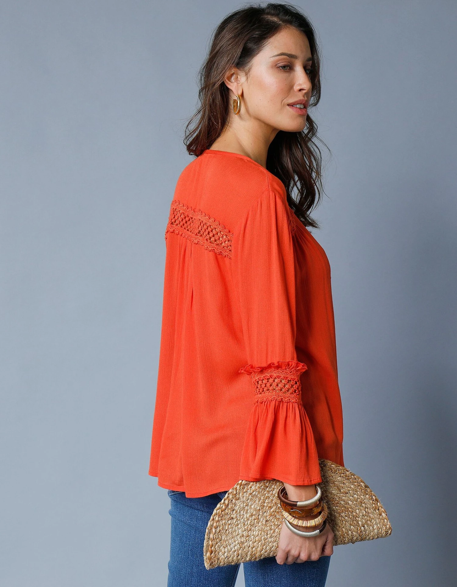 – Manches longues avec galon de macramé ajouré et volant en base