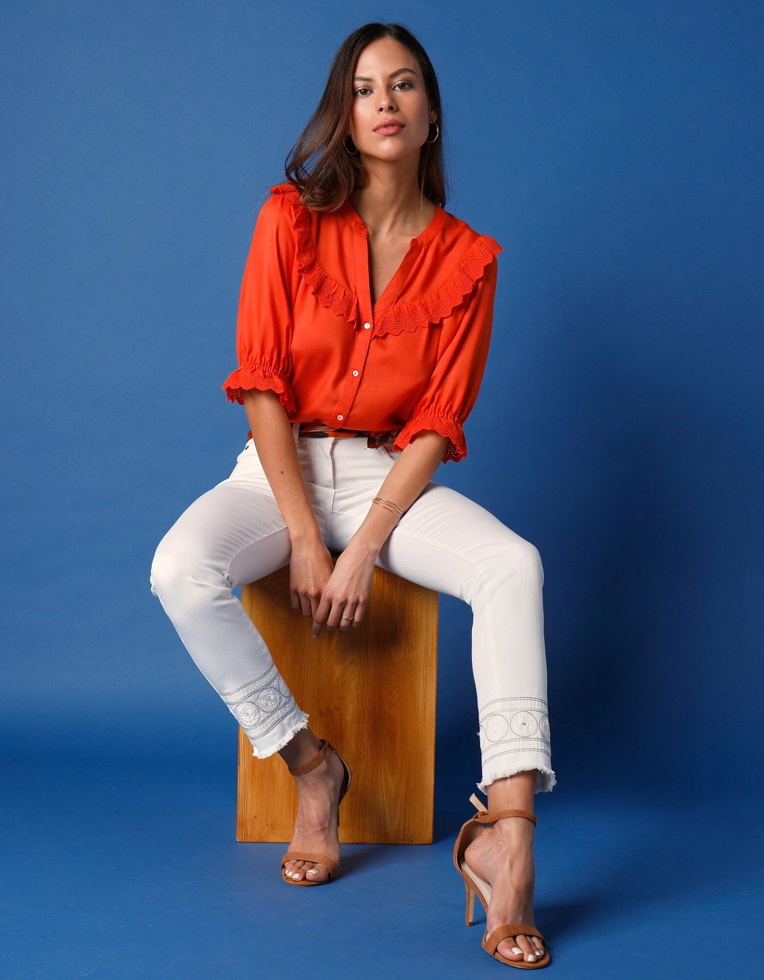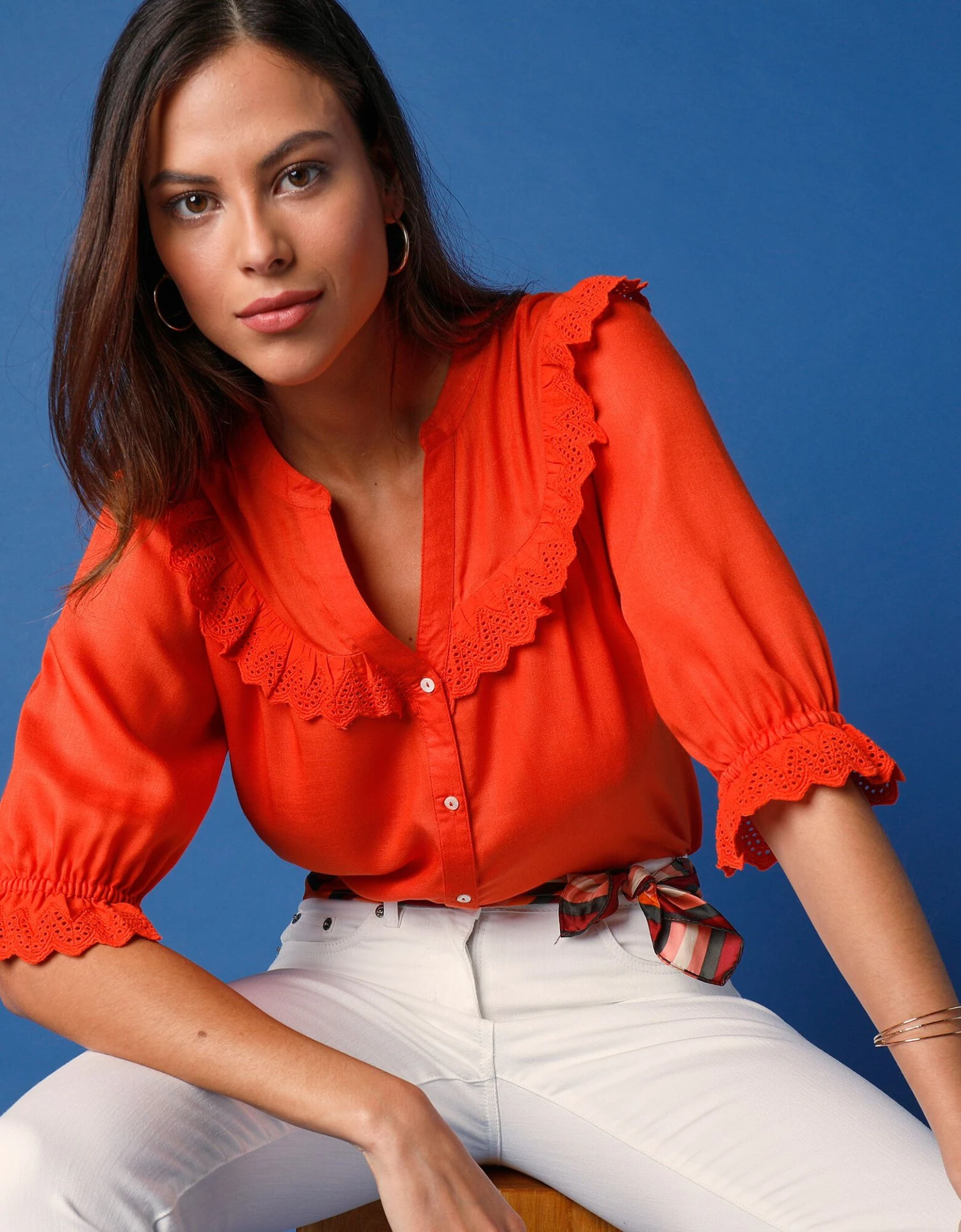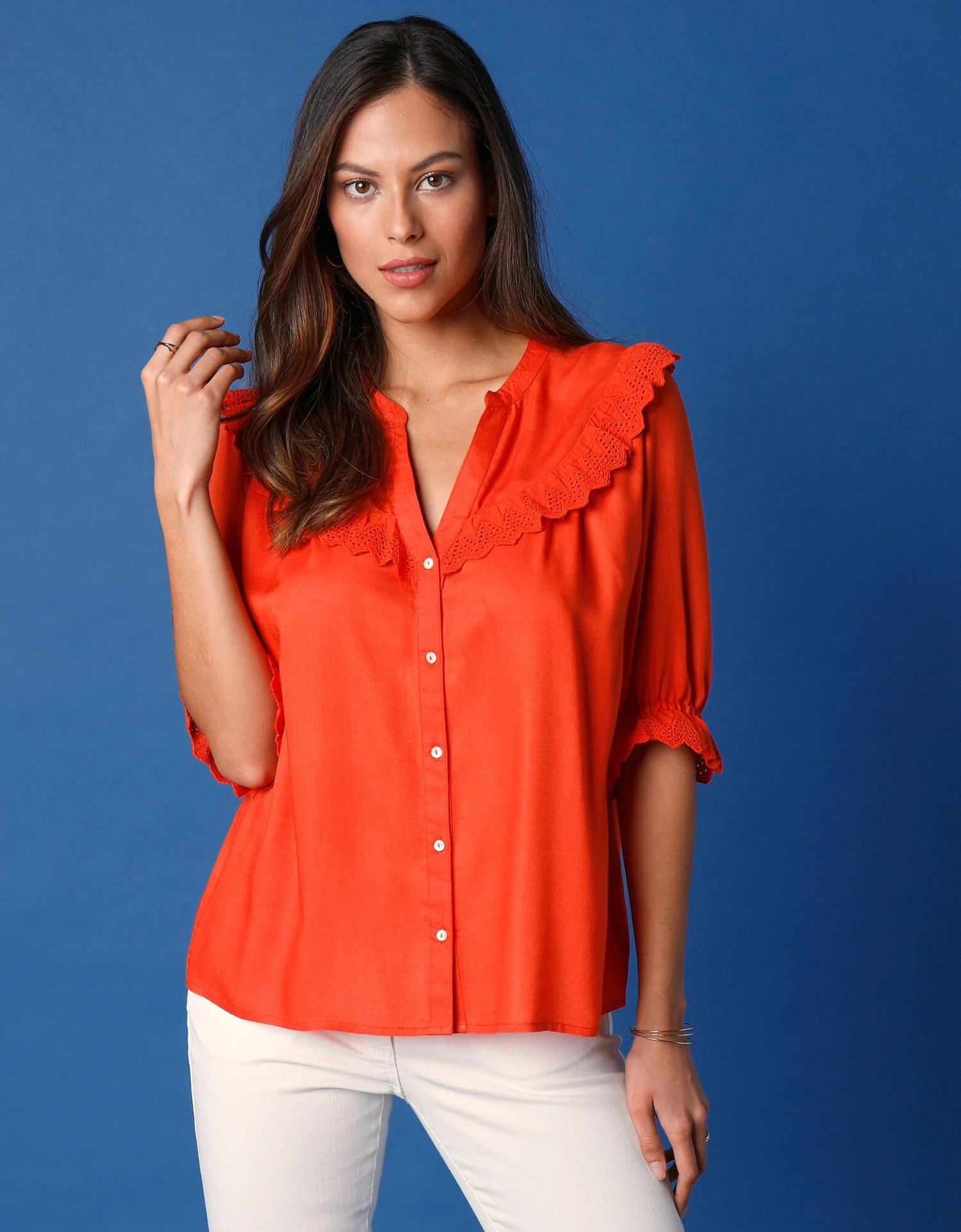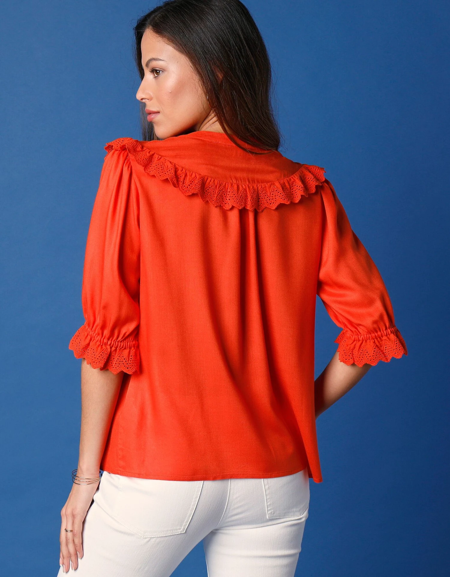 – Manches coudes élastiquées terminées par un volant en broderie anglaise