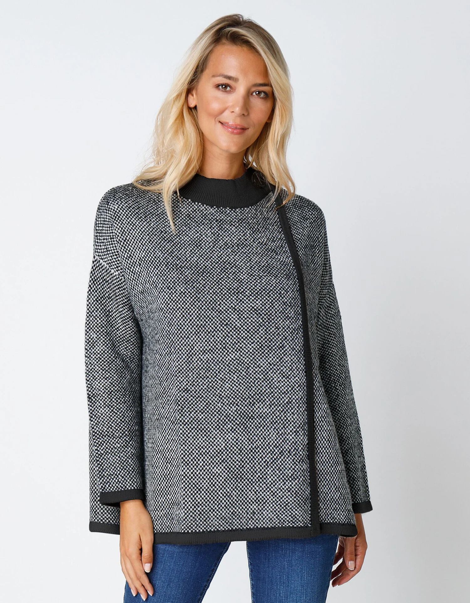 – Col montant finition bord-côtes, fermeture asymétrique pressionnée, animé d’un gros bouton fantaisie