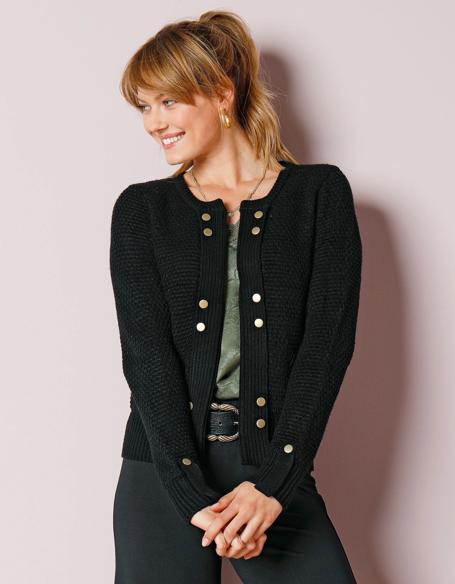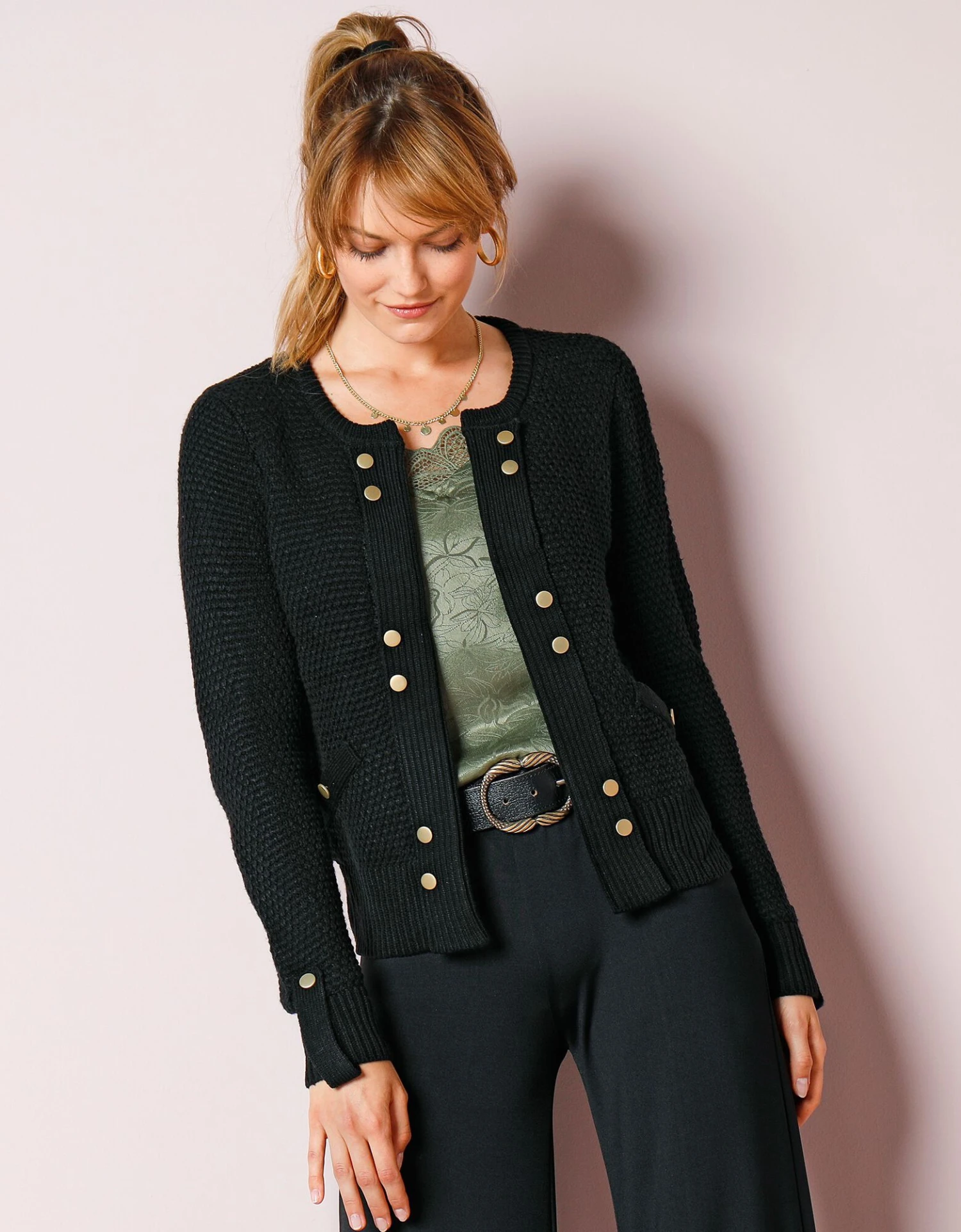– Ouverture soulignée de boutons dorés fantaisie