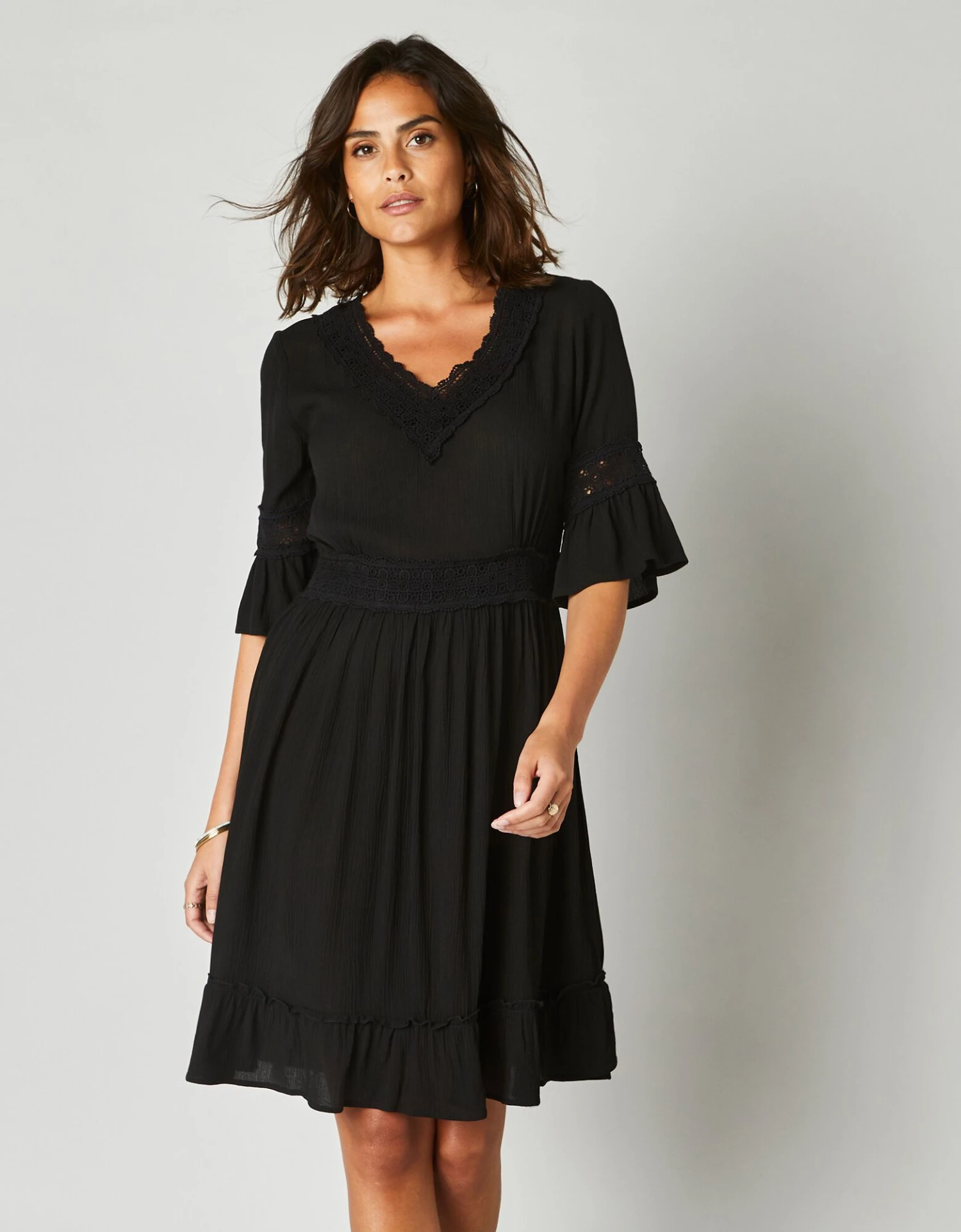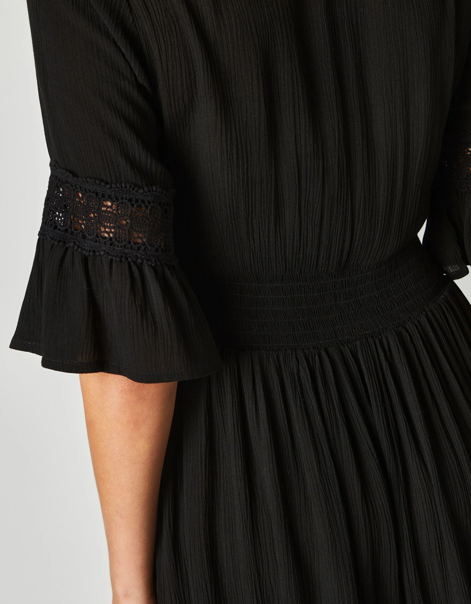 – Taille soulignée d’une bande macramé devant et d’une bande smockée au dos