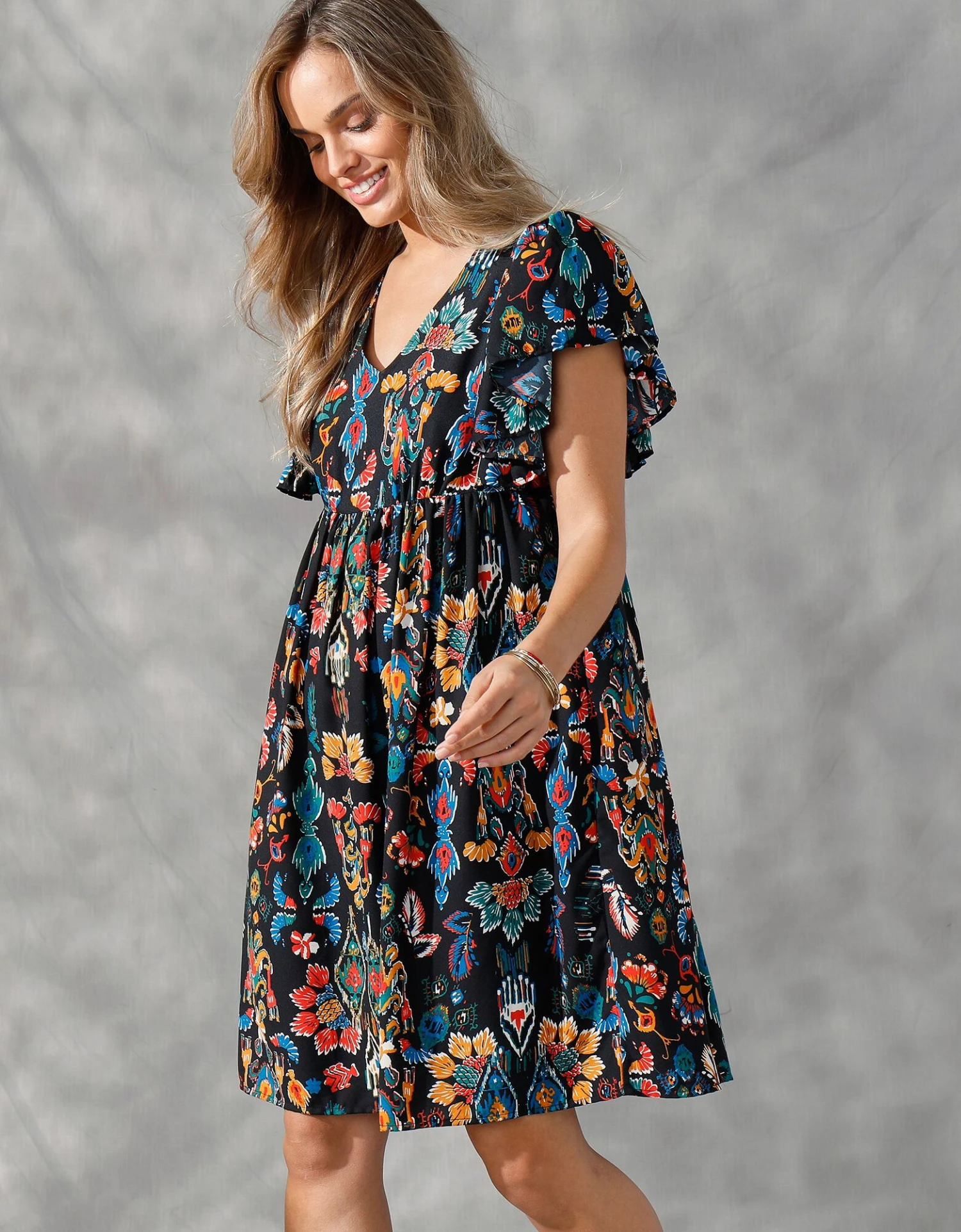 – Large volant froncé aux emmanchures, formant les manches « papillon »
