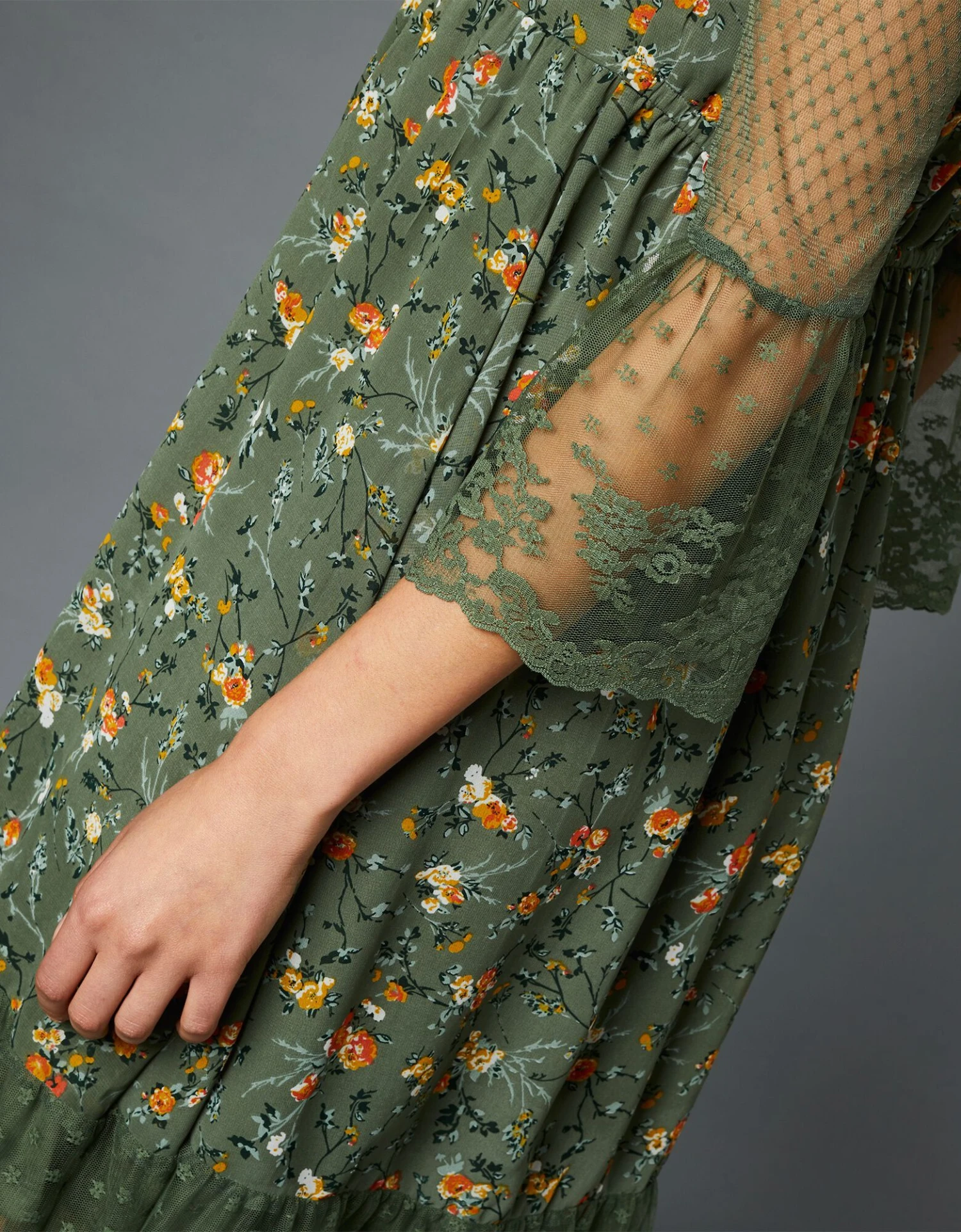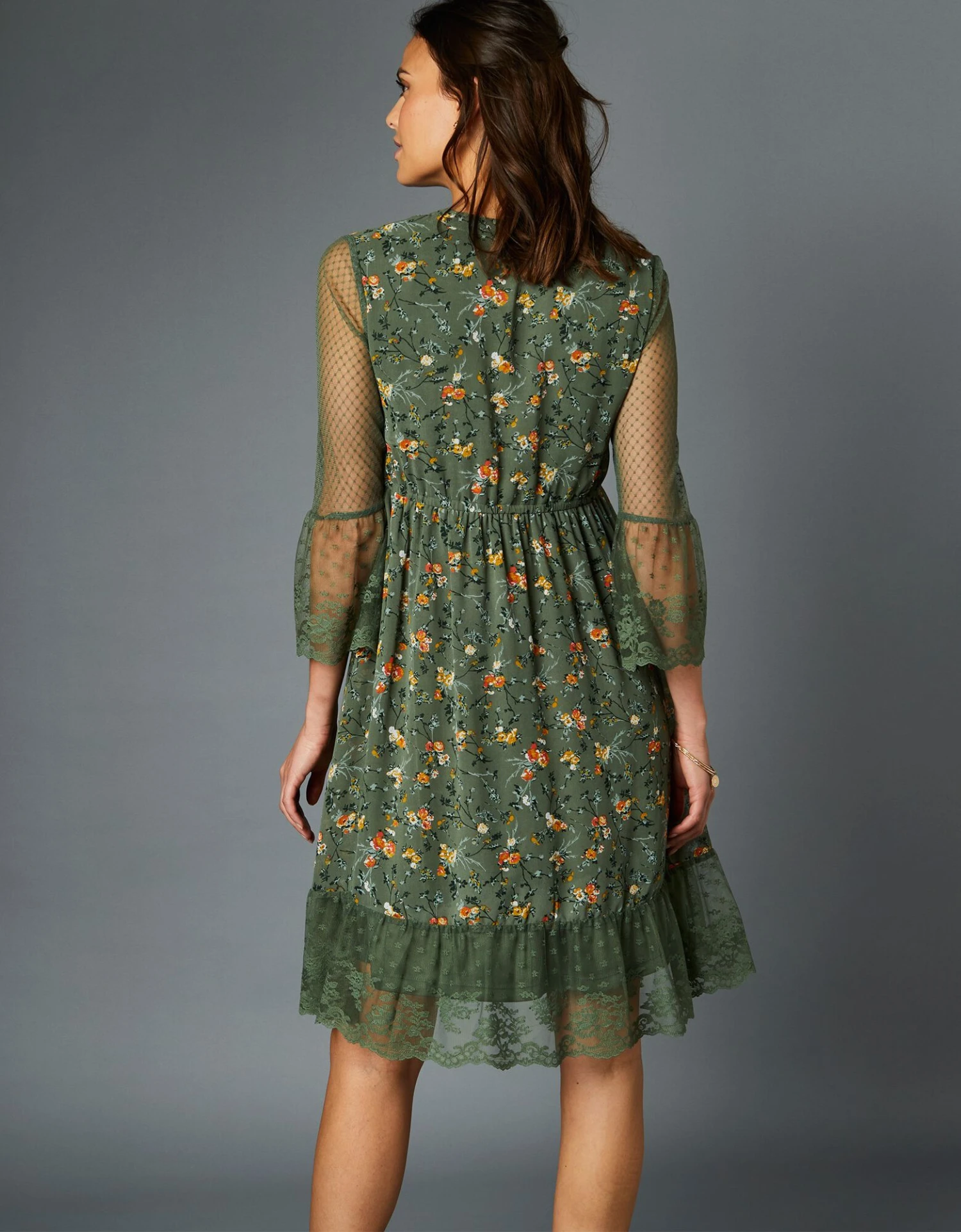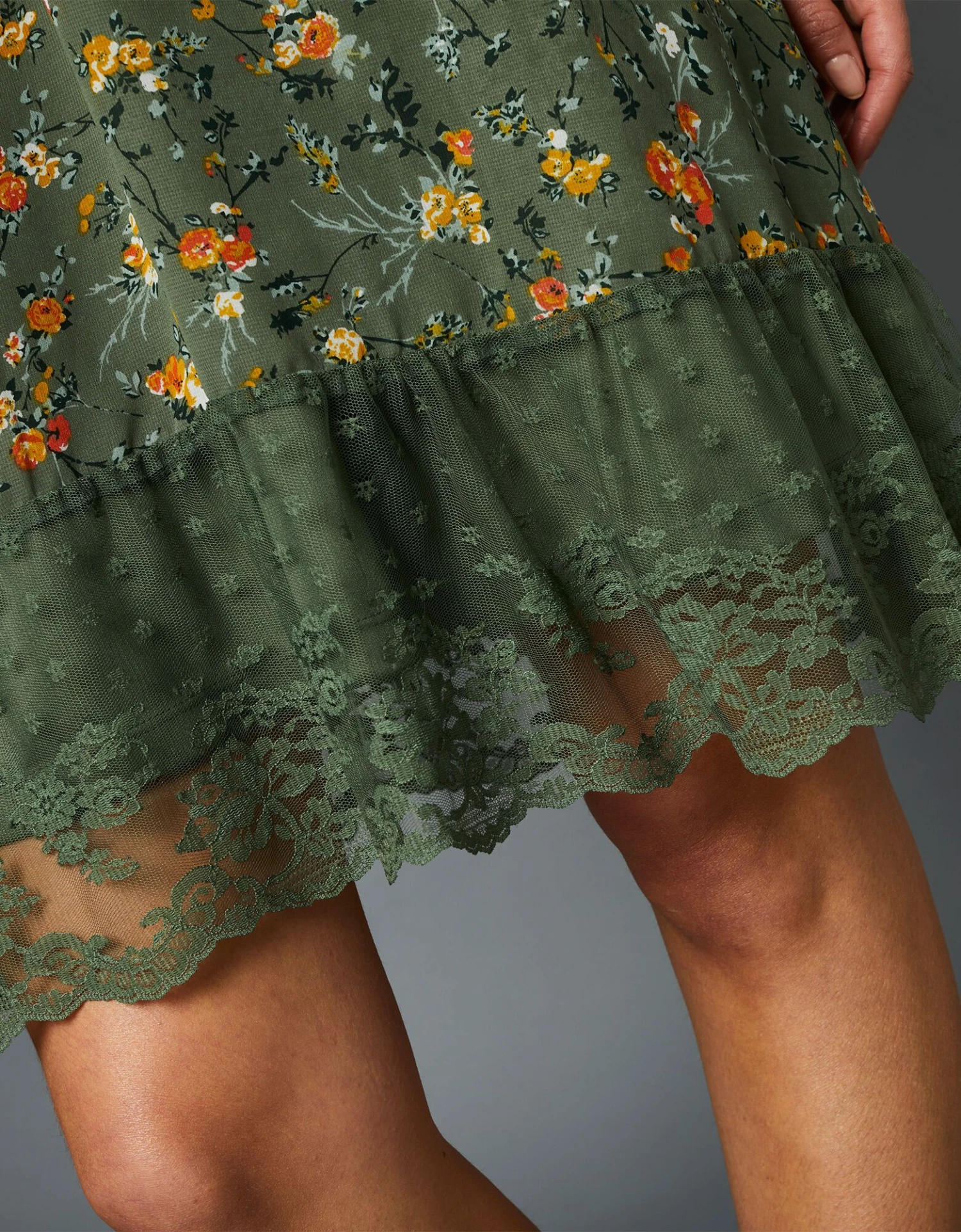 – Volants de dentelle finition écailles aux bas de manches et à la base