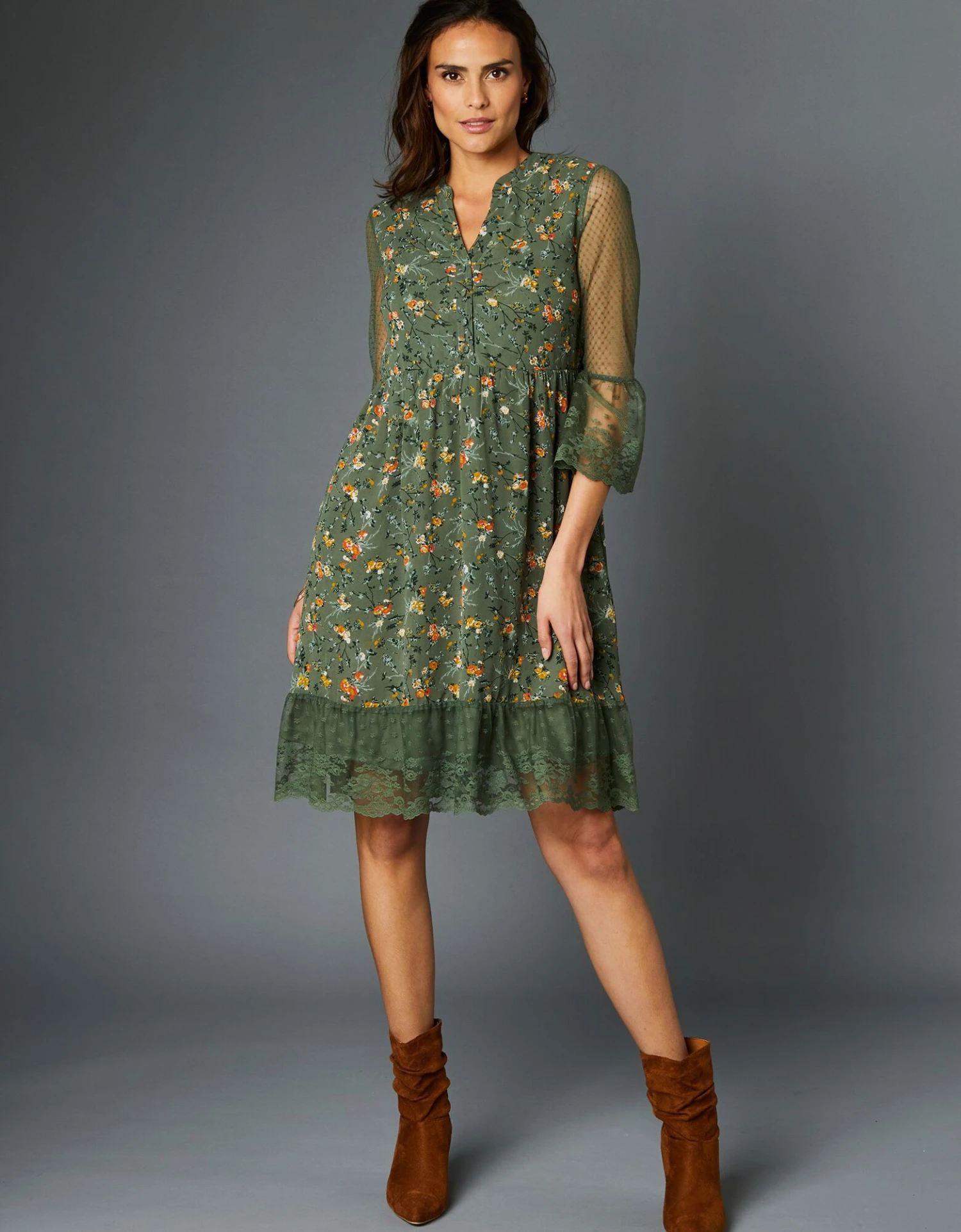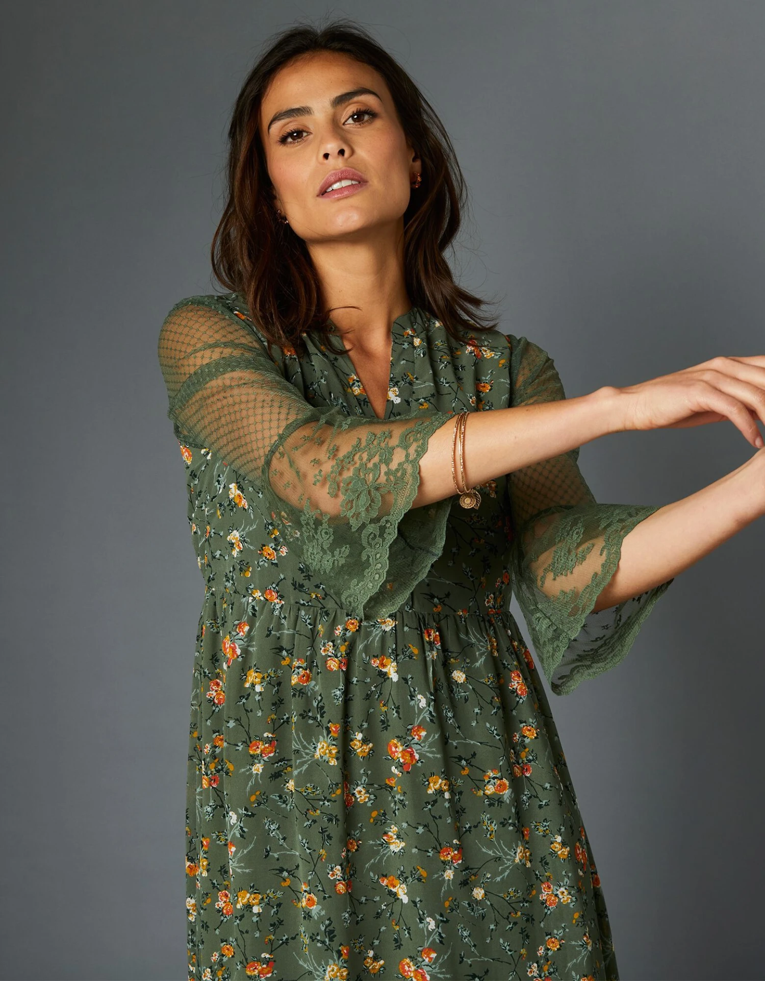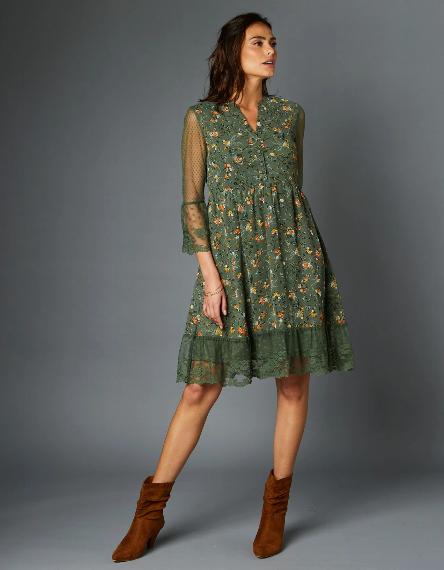 – Volants de dentelle finition écailles aux bas de manches et à la base