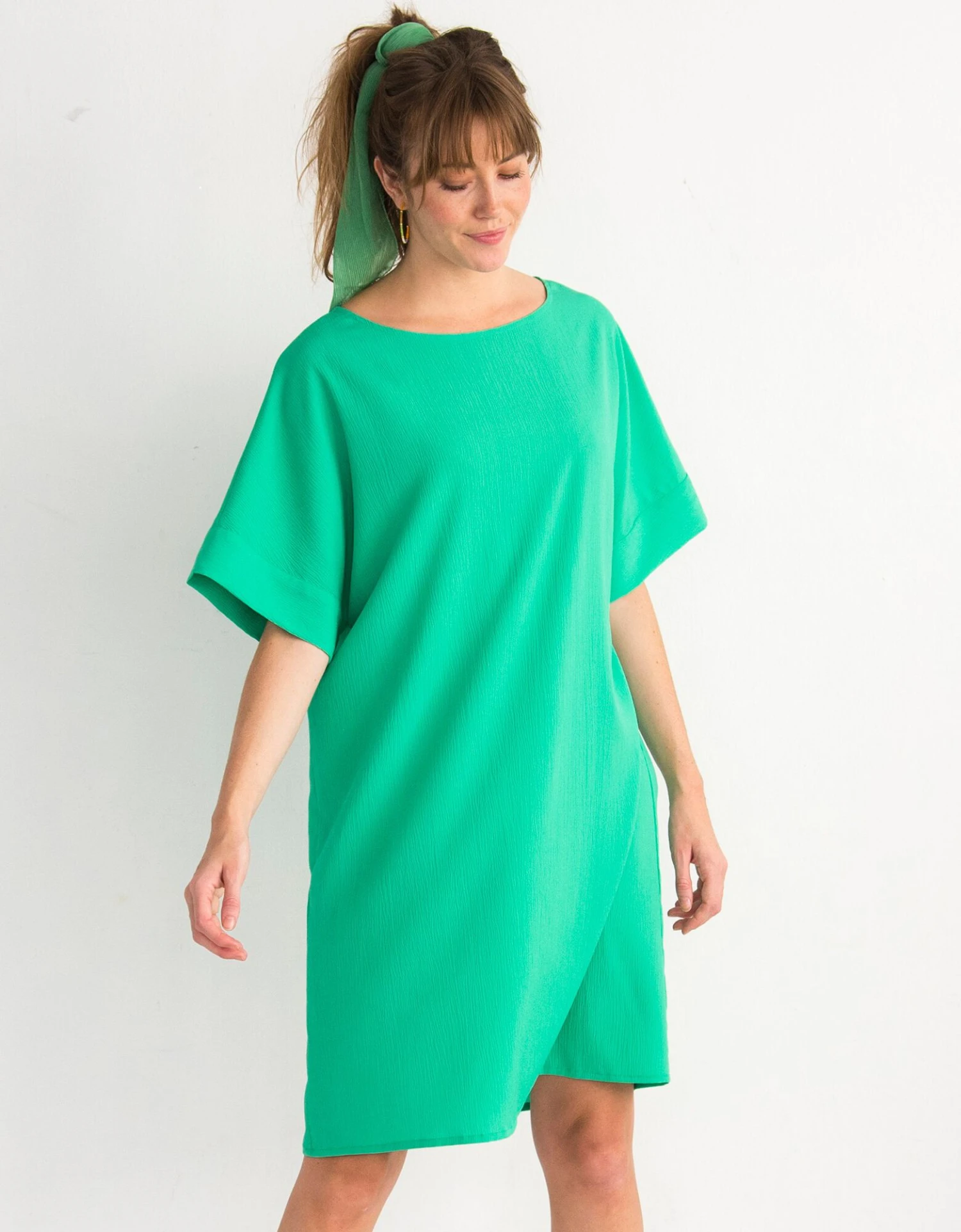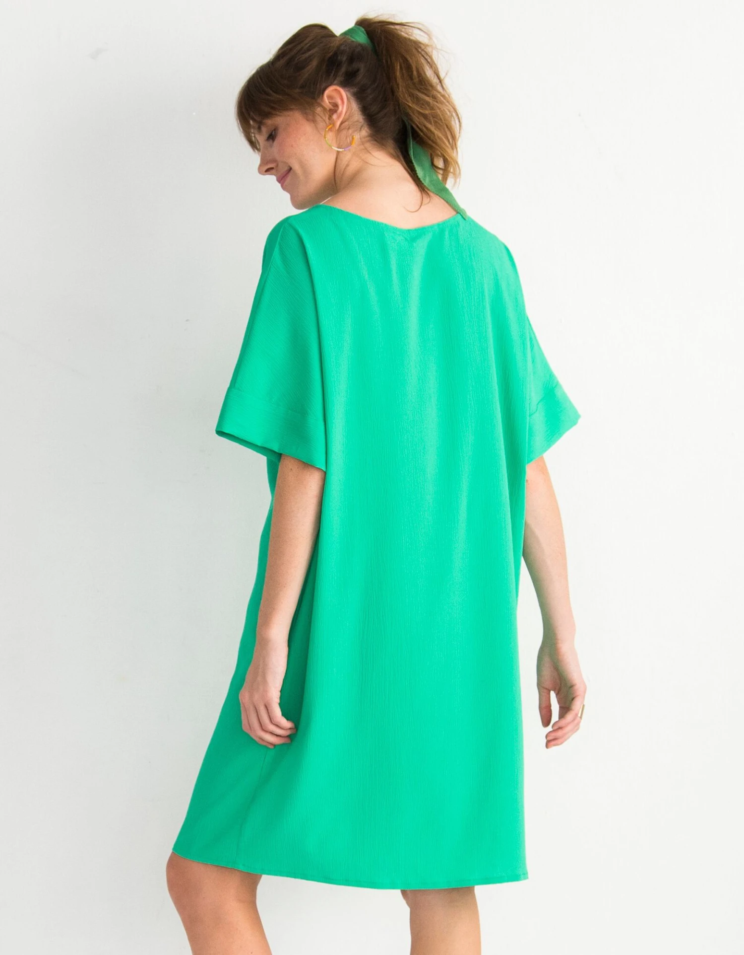 – Larges manches courtes effet « chauve-souris », finies par un revers fantaisie