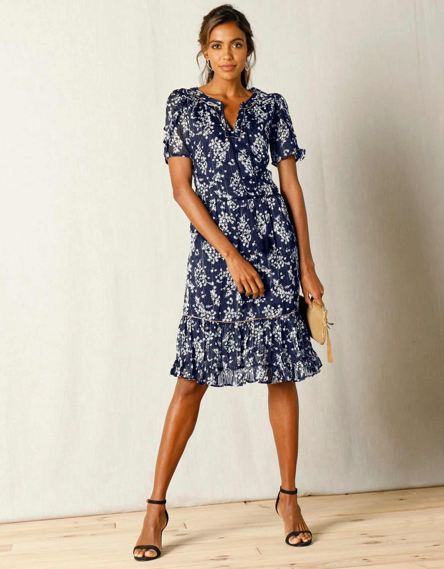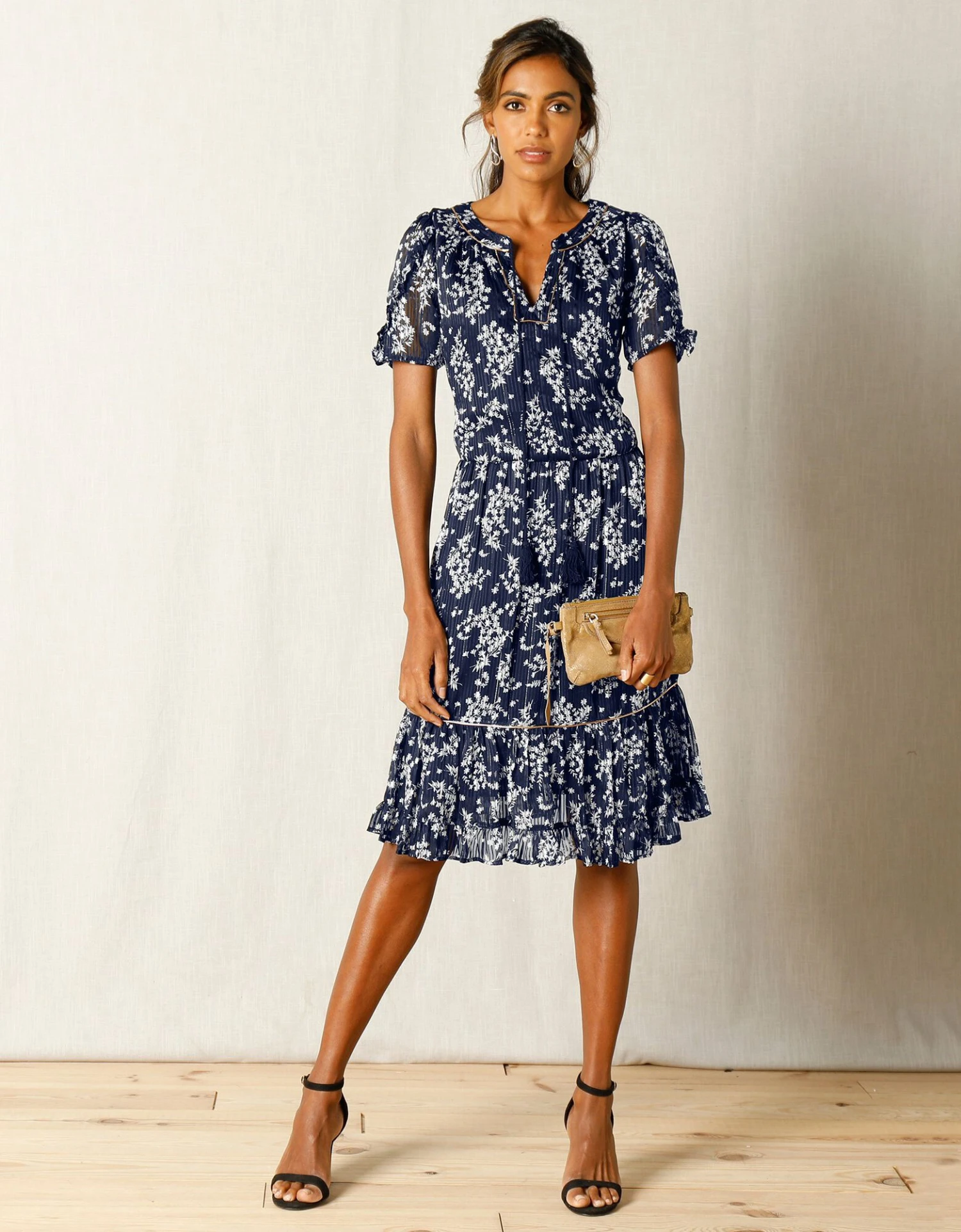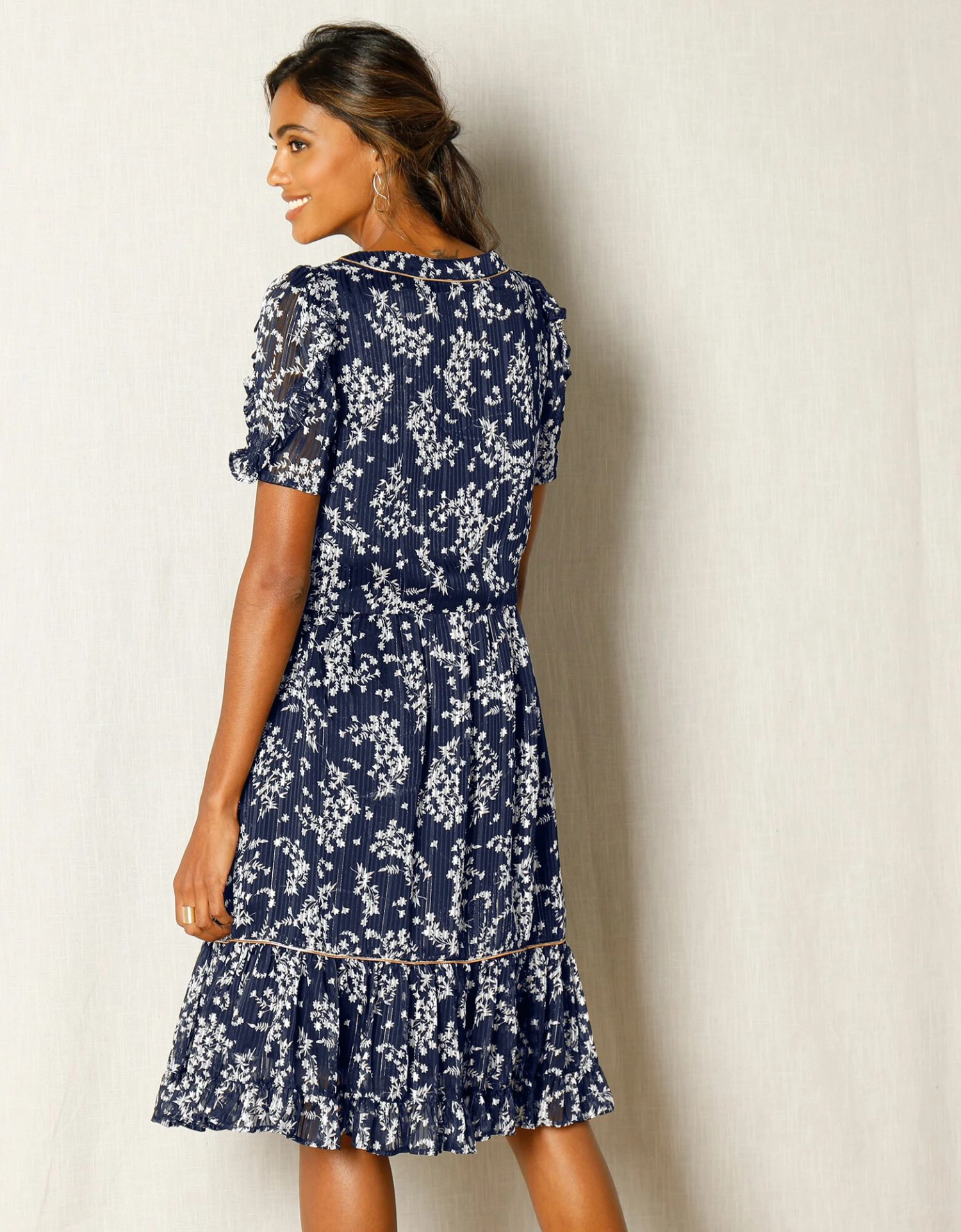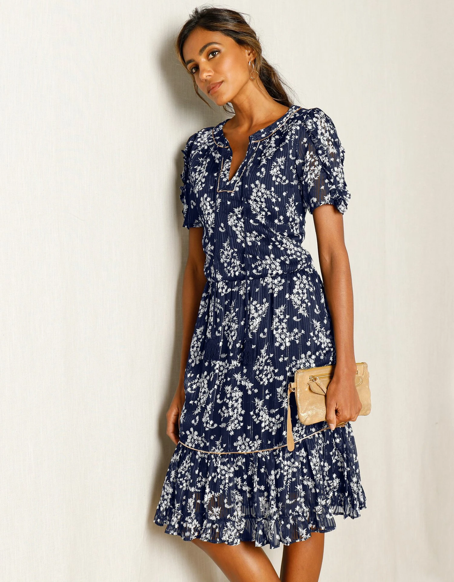 – Double volant à la base rehaussé d’un biais cuivré avec fil Lurex®
