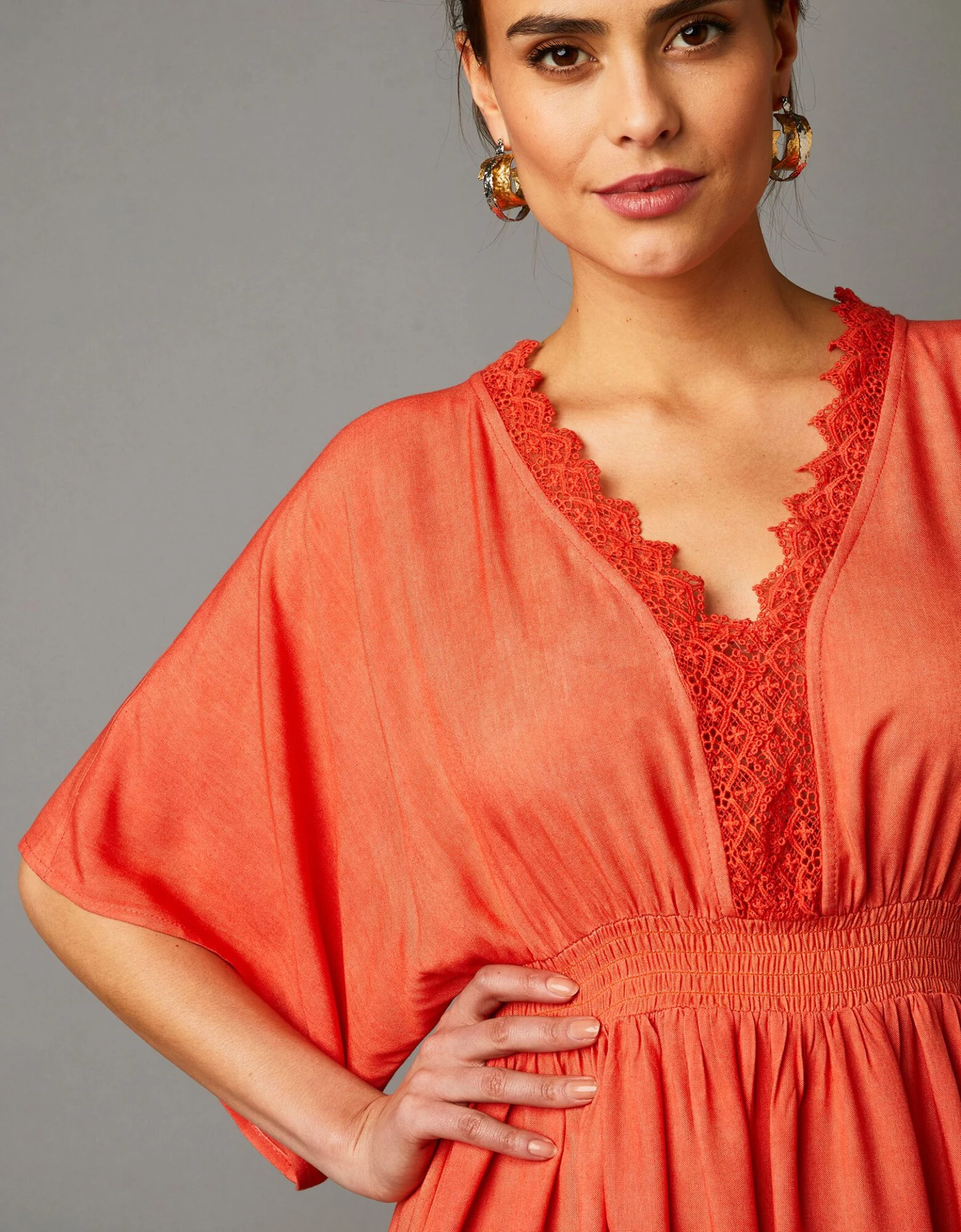 – Col V devant bordé de macramé ton sur ton se prolongeant jusqu’à la taille
