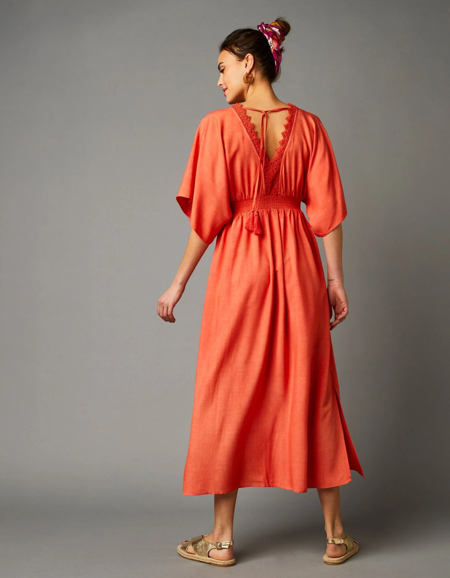 – Profond col V au dos rehaussé de macramé et d’un lien à nouer