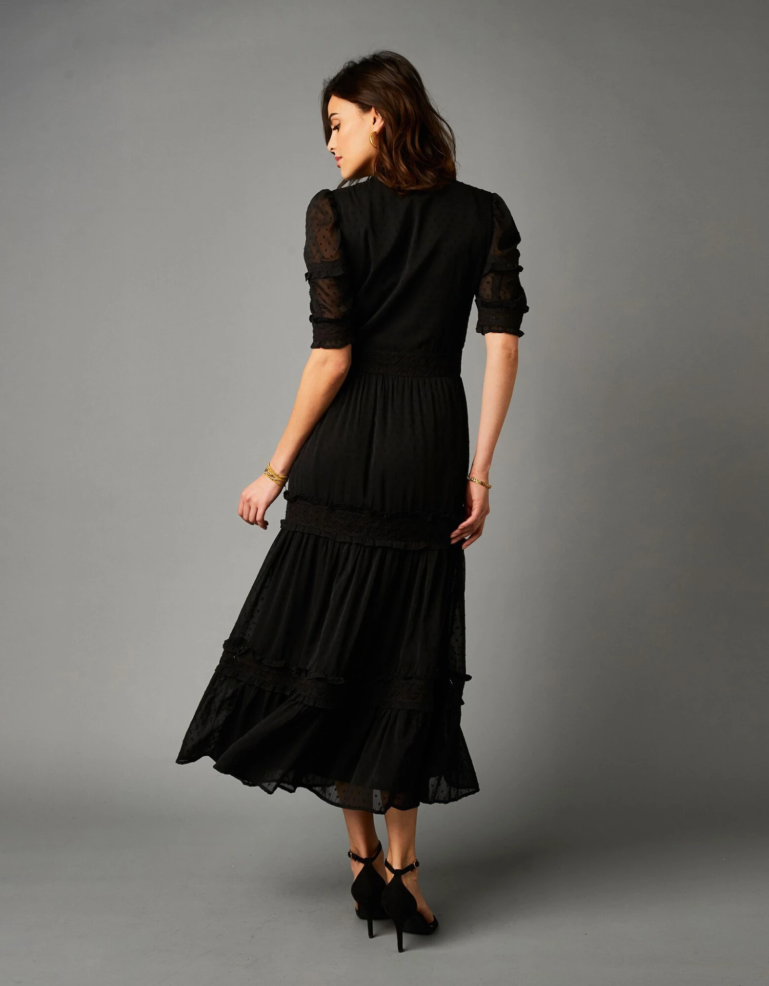 – Belle ampleur élégante et raffinée avec 3 découpes en base, rehaussées de volants froncés et de macramé