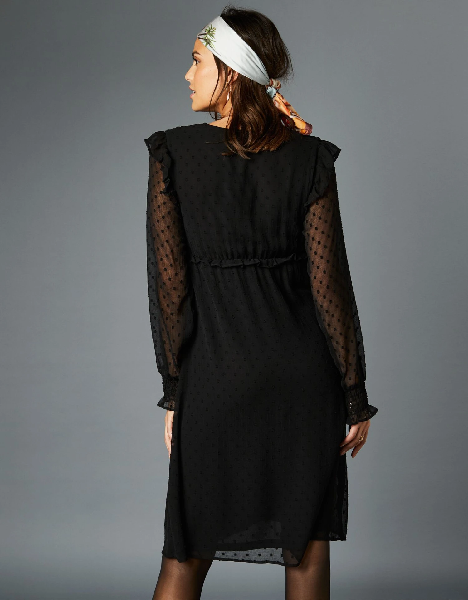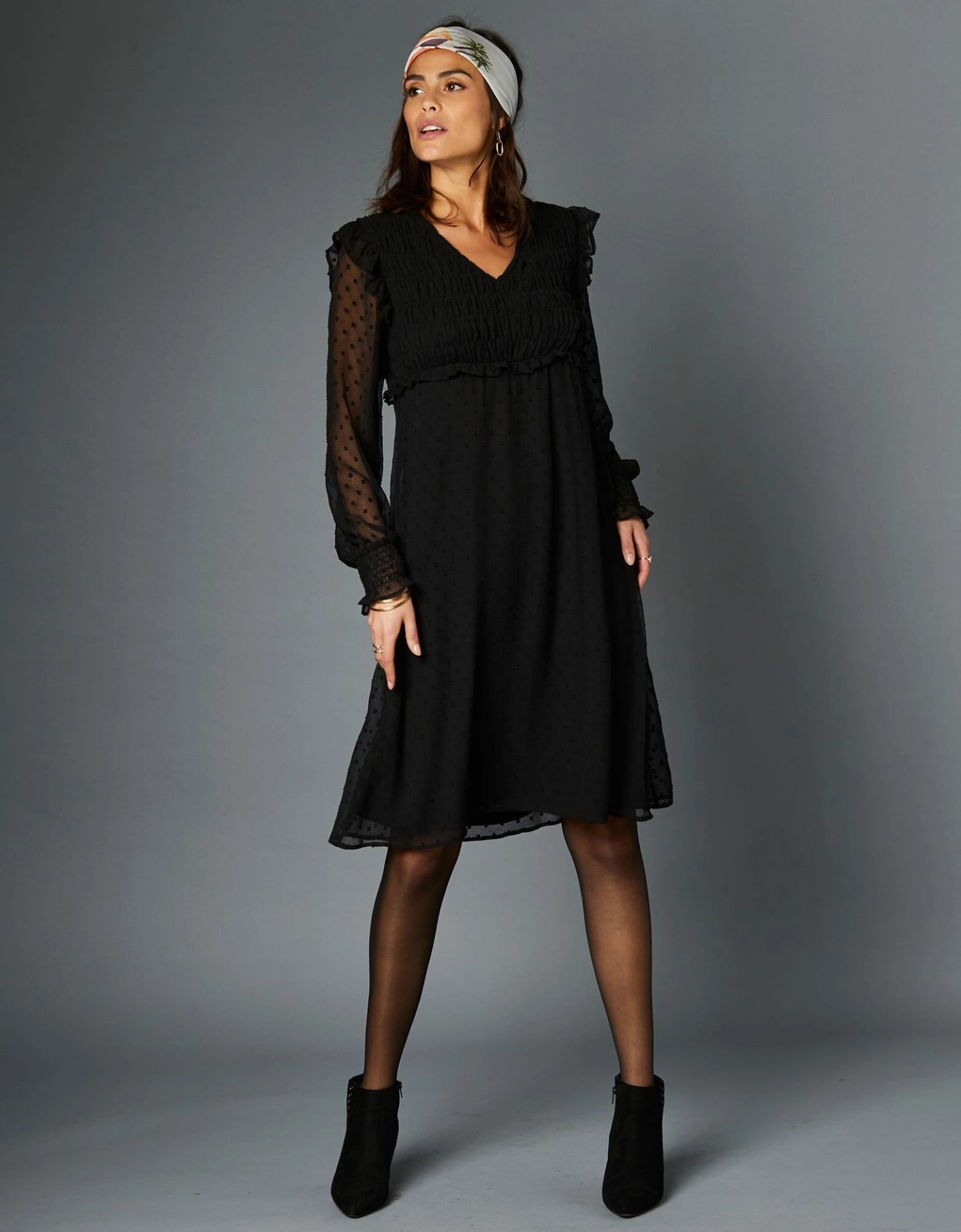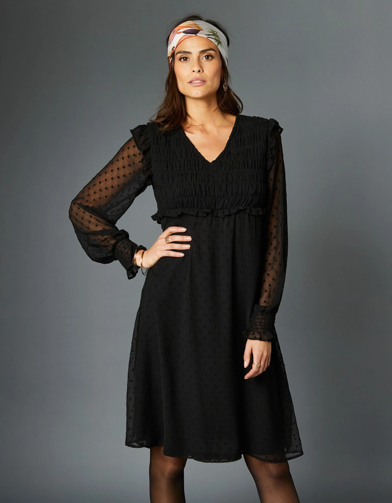 – Découpe sous poitrine élastiquée réhaussée d’un volant