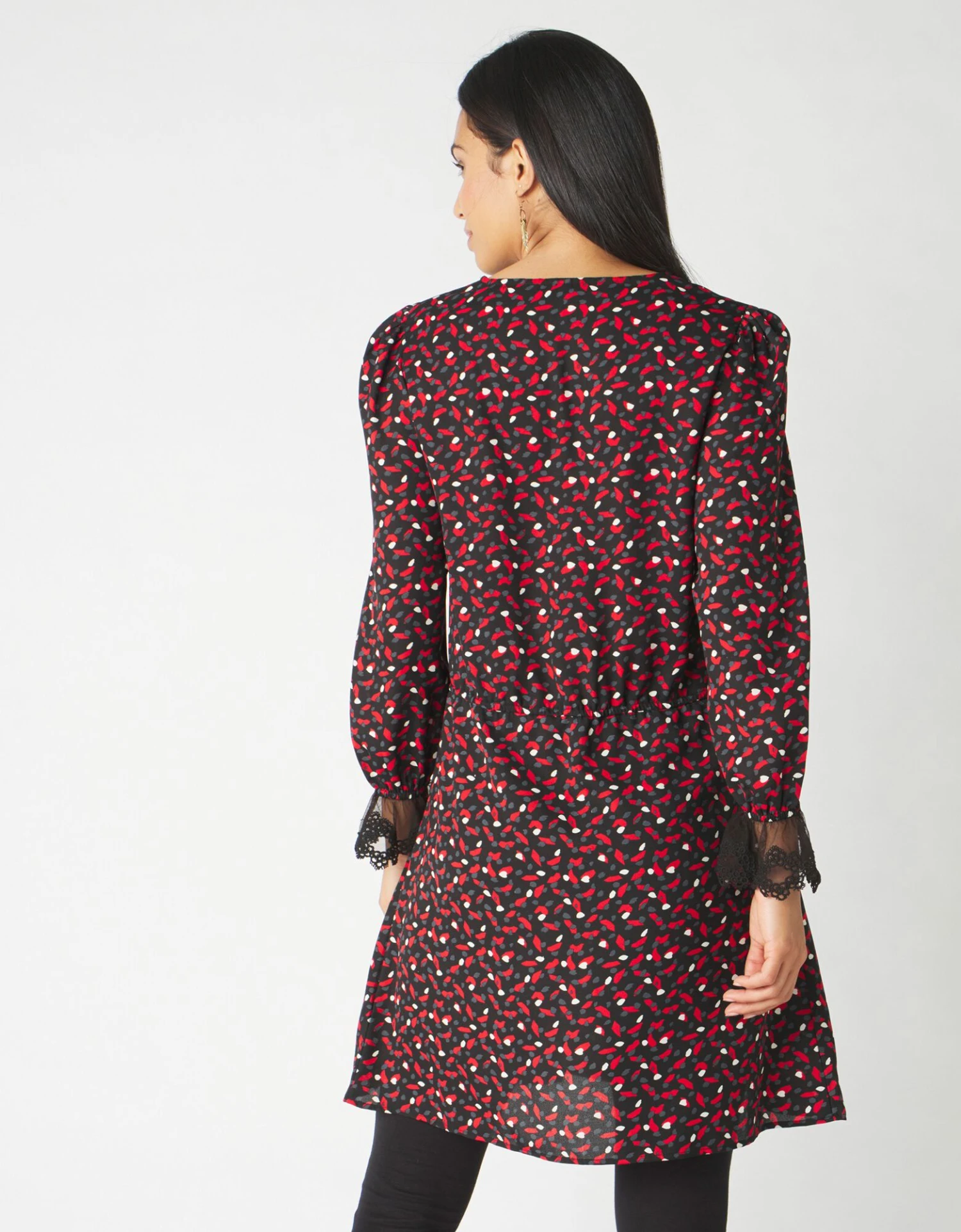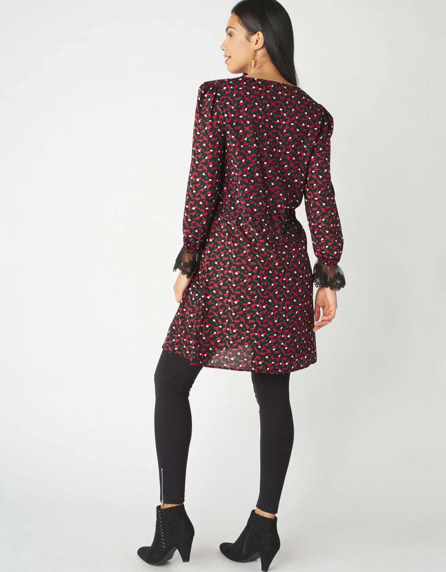 – Manches longues élastiquées finies par un volant en tulle brodé avec effet écailles