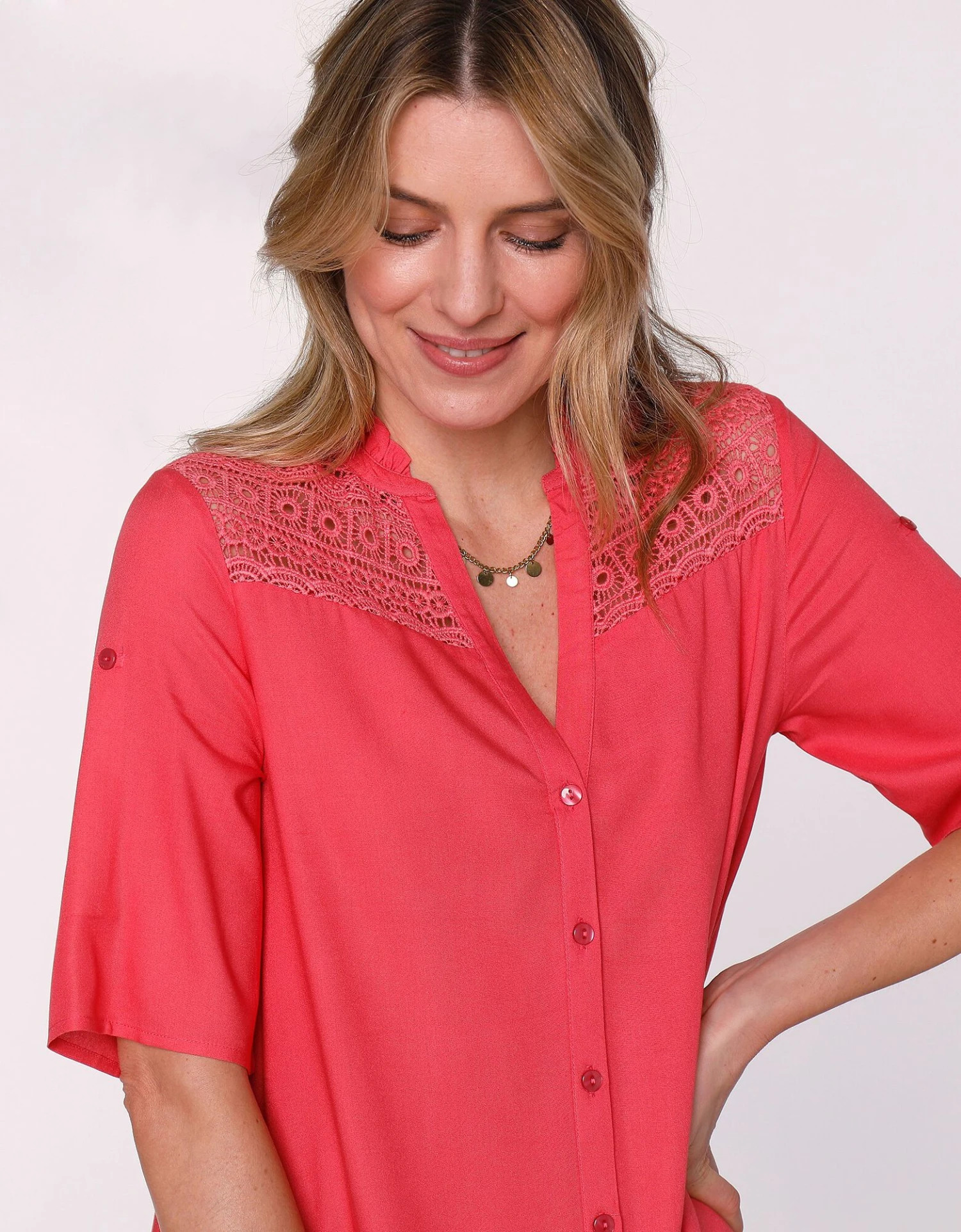 – Manches coudes retroussables par une patte boutonnée